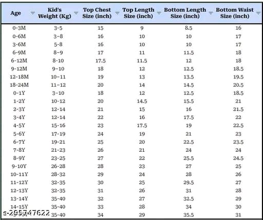 6-12 Months (Top Chest Size : 10 null, Top Length Size: 14 null, Bottom Waist Size: 17 null, Bottom Length Size: 16 null)