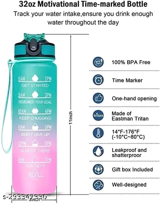 A secure clasp on the flip-top lid is designed to stop leaks and dust entrance. Simply press the button with one hand to open. incorporate a silicone straw so you can drink without worrying about spills. has a reliable carry strap and a unique reflective frosted surface that reacts differently to your environment. In the mouth, which is very easy to clean, ice cubes might fit. This high-quality tritan co-polyester plastic water bottle is 100% BPA and toxin-free, odourless, and ideal for daily water drinking. Perfect for hiking, biking, camping, jogging, yoga, or any other sport, as well as working out at home, in the gym, or at the office.This amazing bottle is the best present for you, your friends, family, coworkers, and anybody else who values living a healthy lifestyle. It features a large 32oz capacity and is available in a variety of vibrant colours and sweet design options.Choose a fitness water bottle to stay hydrated and healthy. It is a great gift for you and your loved ones and comes in a number of vivid colours. Please feel free to contact us your concerns if you are not completely happy with our merchandise.