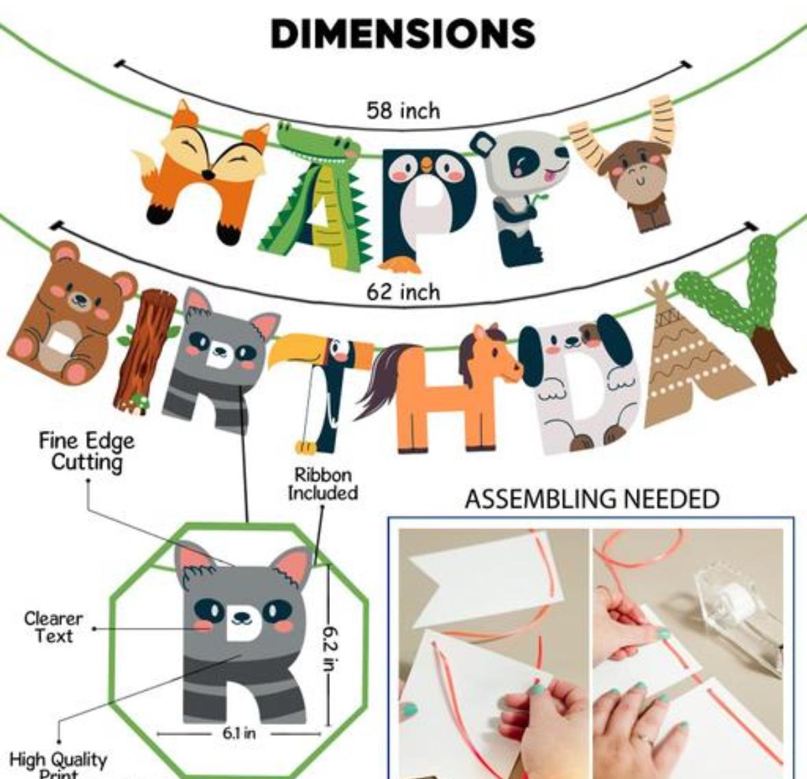 Package Includes : - 1set Animal Theme Happy Birthday Banner, 8pcs Animal Cutouts, 6pcs Animal Foil Balloons, 30pcs Metallic Balloons, 1pc Double Tape, 1pc Ribbon.