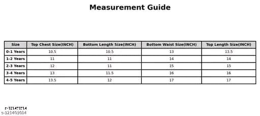 2-3 Years (Top Chest Size : 24.5 in, Top Length Size: 15 in, Bottom Waist Size: 24 in, Bottom Length Size: 11.5 in)