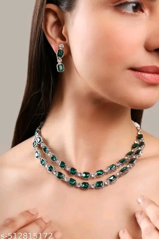 Name : Multilayer Emerald Green color necklace earrings Statement American Diamond,Indian Jewelry , Wedding jewellery