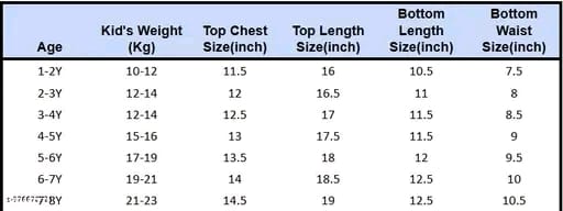 5-6 Years (Top Chest Size : 12.5 in, Top Length Size: 17 in, Bottom Waist Size: 8 in, Bottom Length Size: 17 in)
